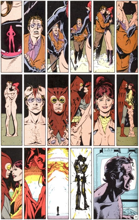 aquele ar de mistério e fantasia que permeia a obra do Senhor dos Sonhos. Mas, o seu trabalho como ilustrador/pintor/artista plástico/desenhista nunca me chamou a atenção, muito pelo contrário, deixava-me desorientado e desitaressado pelo visual. Quando li Whatchmen pude perceber que um desenhista pode transmitir essa emoção de detalhes, ao mostrar uma cena estática ou com uma sequência de imagens (como esta que está ao lado) mostrando o poder que o desenho possui sobre os olhos do leitor. A leitura visual nos quadrinhos faz parte da linguagem do próprio quadrinho.