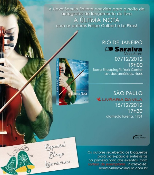 Saudações, caros leitores! Alguns meses atrás os escritores Felipe Colbert e Lu Piras anunciaram que uniram as suas mentes com o objetivo de escreverem um livro que seria voltado para o público juvenil e que se chamaria “A Última Nota”. Então, o tempo passou, a capa foi divulgada, os três primeiros capítulos foram disponibilizados para leitura e agora estou divulgando o evento de lançamento que contará também com uma sessão de autógrafos, além de algo a mais para os blogueiros literários!