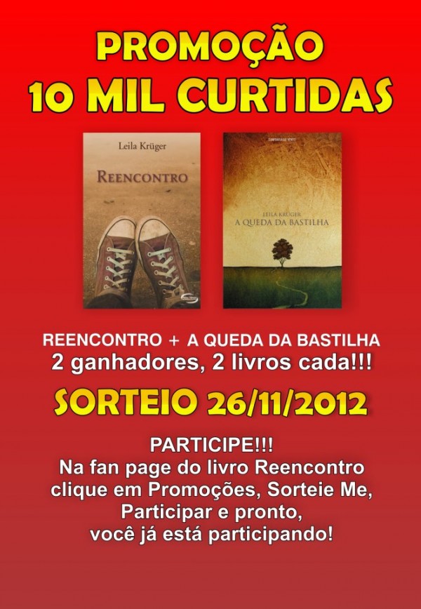 Saudações, caros leitores! Estou passando para avisar sobre uma sensacional promoção organizada pela autora Leila Kruger na qual ela sorteará os seus dois livros: “Reencontro” – você pode ler a resenha Aqui – e “A Queda da Bastilha”! Quer saber como concorrer? Veja: