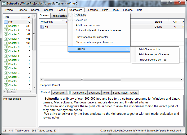 E se você é daquelas pessoas – como eu =P – que não curte muito ler na tela do computador, o yWriter te permite imprimir todo o seu projeto ou só listas individuais, como por exemplo, só a lista de personagens ou de locais.