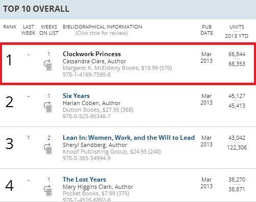 Ela não só encabeça a lista do New York Times como também dos mais vendidos do USA TODAY’s Best-Selling e do Top 10 BookScan’s . A façanha foi tão grande que Cassandra Clare ultrapassou a trilogia “JOGOS VORAZES” como N º 1 da lista de best-sellers.