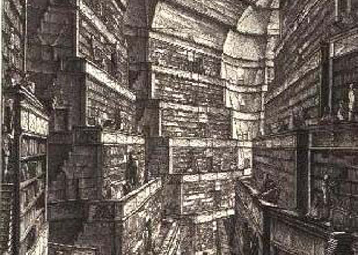 A Biblioteca de Babel, livro do escritor argentino Jorge Luis Borges, é um enorme labirinto de prateleiras com livros. ‘Suspeito que a espécie humana está prestes a ser extinta, mas a Biblioteca perdurará: iluminada, solitária, infinita, perfeitamente imóvel, equipada com volumes preciosos, inútil, incorruptível, secreta’, diz o narrador da história.