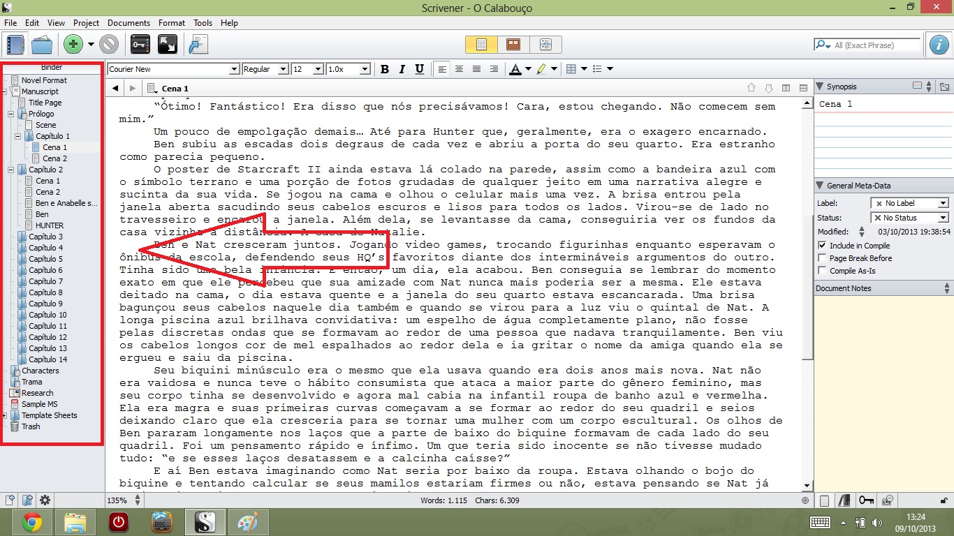 Com essa ferramenta, o programa permite que você divida o seu texto em capítulos e subdivida os capítulos em cenas. Isso deixa a ordem dos elementos tão absurdamente organizados que é quase orgásmico. Eu juro.
