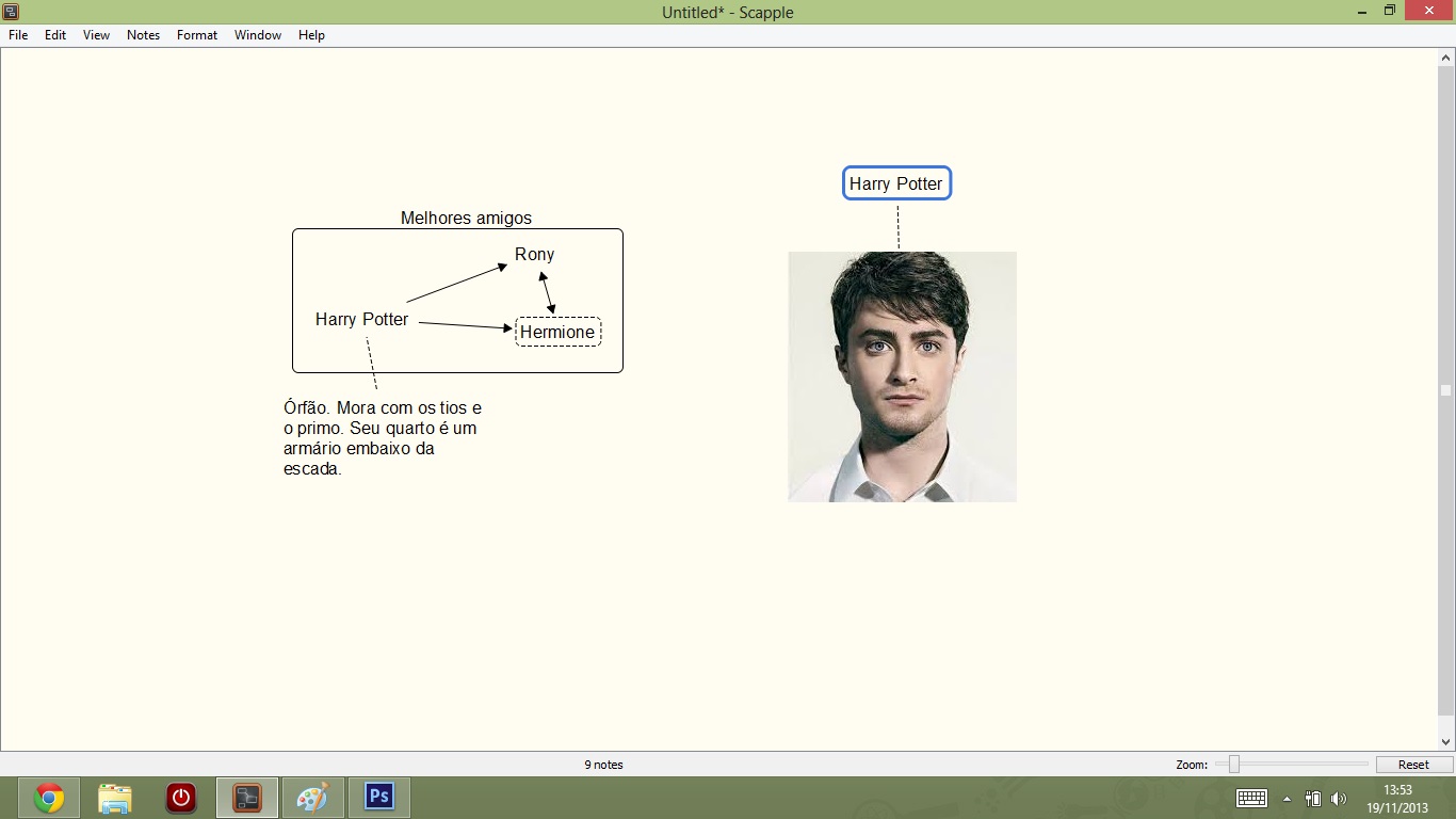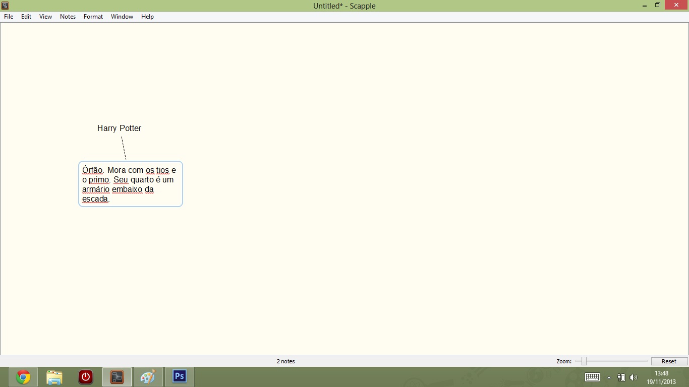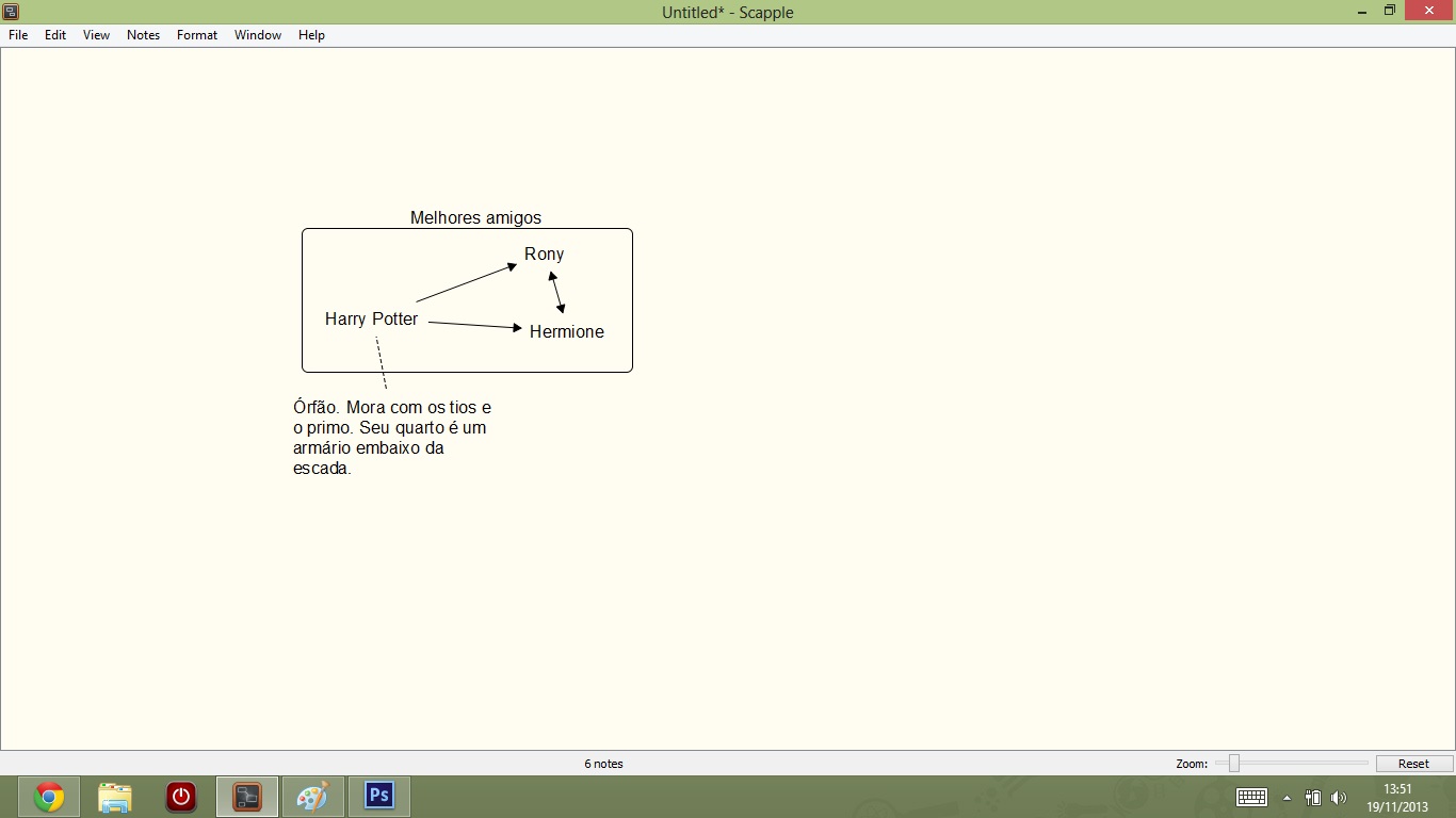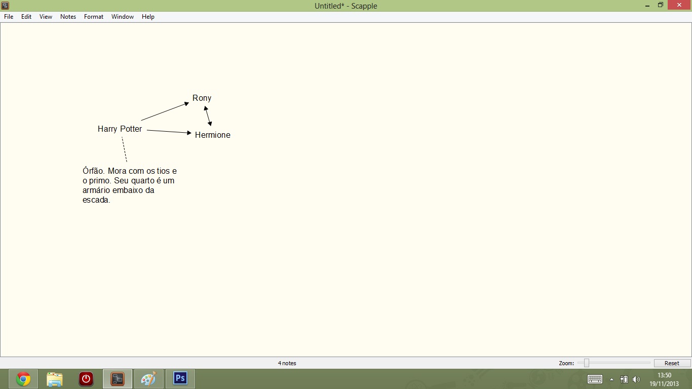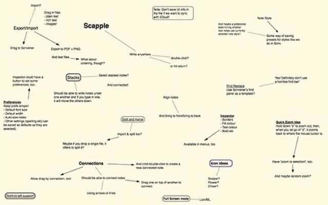 Enquanto outros programas que já apresentamos estão mais relacionados ao trabalho de escrita em si, o Scapple é mais útil na etapa inicial de organização da história. Nada que você não possa fazer nas descrições cena a cena do yWriter, no campo de notas do Scrivener ou até mesmo em arquivos separados do Word ou outro editor de texto de sua preferência. Mas, como sempre, quando um programa é feito especificamente para uma coisa, ele consegue ser espetacular naquela coisa de modos que você não tinha imaginado. Ele acaba resolvendo problemas que você, como escritor, nem sabia que tinha. E esse é o grande ponto positivo do Scapple.