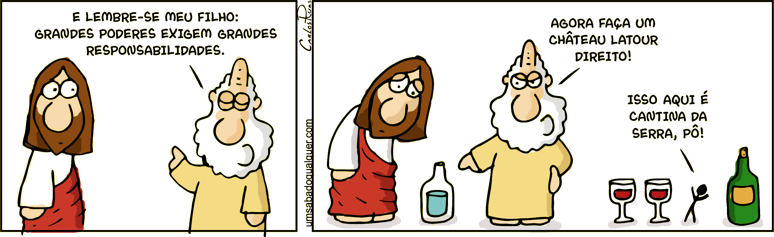 Onde você ouviu a frase: “Com grandes poderes, vem grandes responsabilidades”?, dita por Tio Ben ao jovem Peter Parker, nas páginas das HQ’s do Homem-Aranha, a frase ficou eternizada na memória dos leitores. Para completar o sentido da tirinha é preciso resgatar o peso que esta frase tem para Parker, nos quadrinhos, apesar de não saber que seu jovem sobrinho possuía os poderes do Aranha, o sábio tio o alertou, que ter aquela capacidade exigia dele uma responsabilidade maior do que quando ele não as possuía. Agora vem a pergunta: por que o artista de Um Sábado Qualquer a utilizou? Sabendo que Cristo, é o filho de Deus e segundo a Bíblia transformou água em vinho, seu Pai, Deus, lembra-lhe de que seus poderes trazem responsabilidades como fazer um bom vinho.