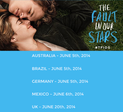 O autor John Green compartilhou em seu perfil pessoal no facebook as novas datas de estreia da adaptação de A Culpa é das Estrelas e dentre elas está a do Brasil que antes seria dia 13 de junho. Agora, o filme chegará aos cinemas brasileiros em dia 5 de junho.