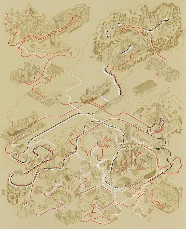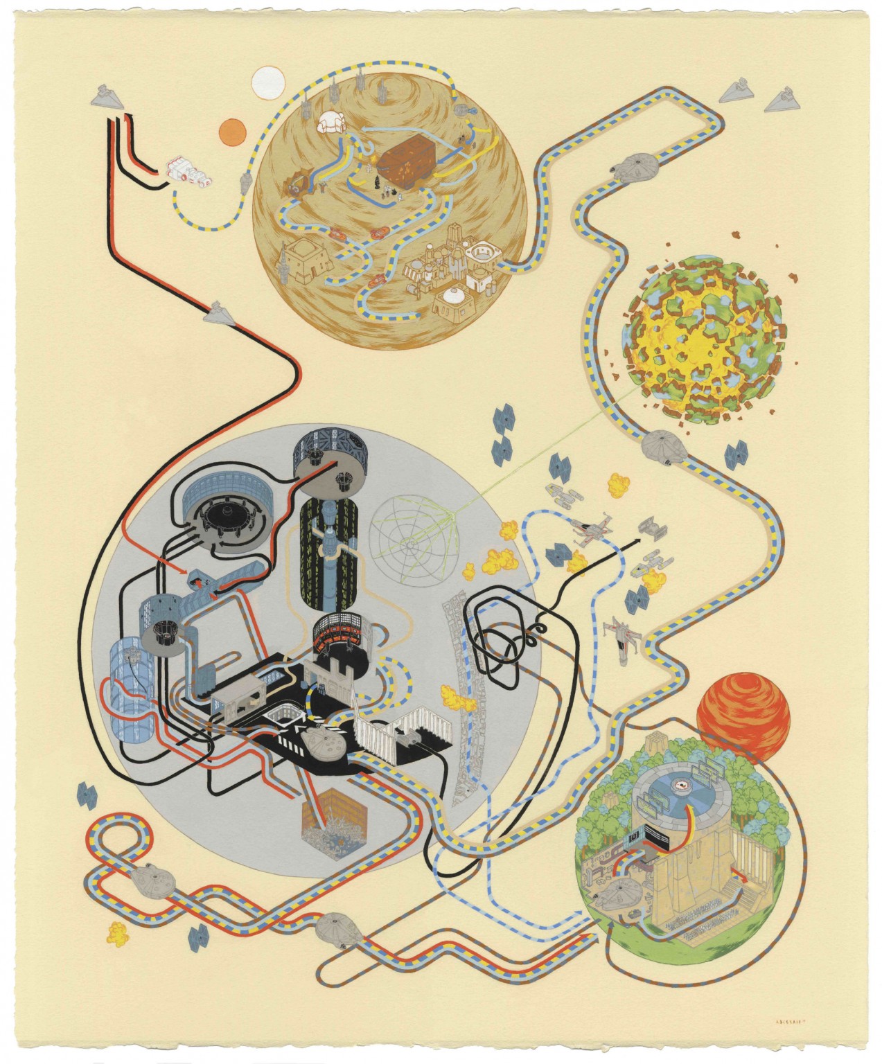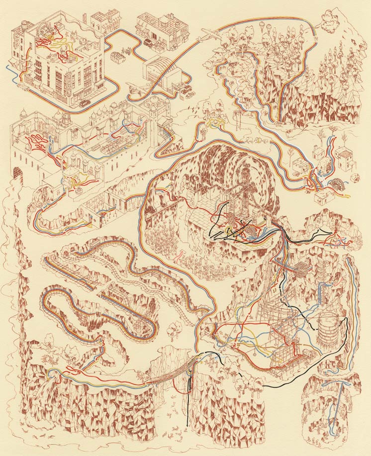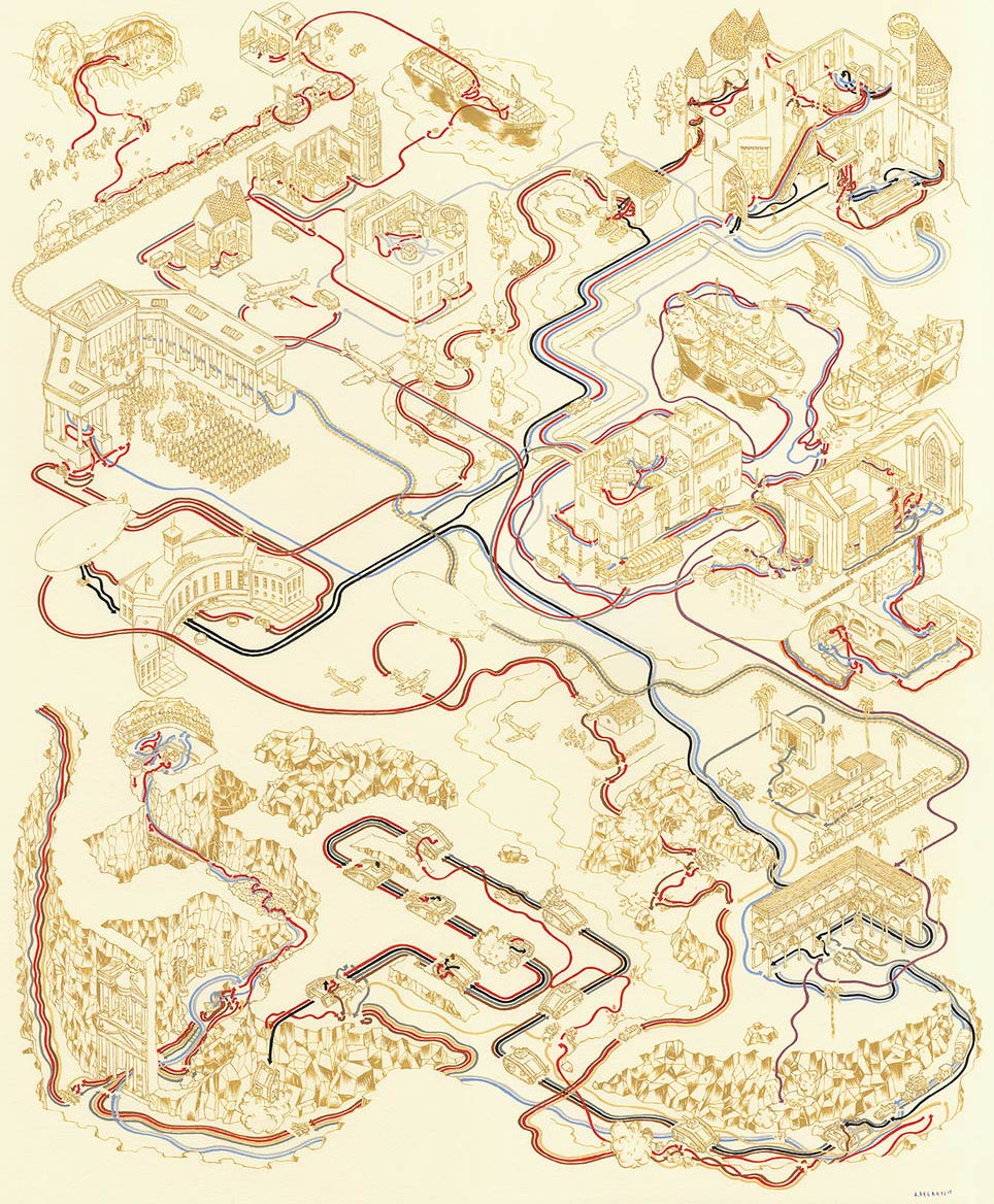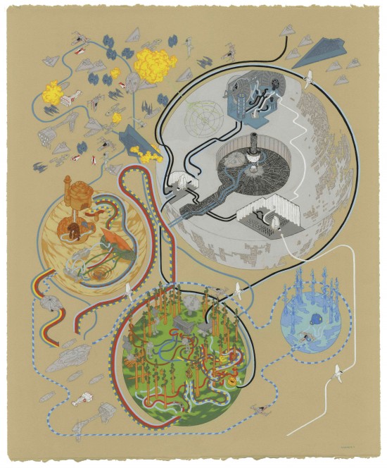 O artista Andrew DeGraff é conhecido nos EUA por fazer mapas, apontando as principais localizações de filmes clássicos como Star Wars e Indiana Jones. Recentemente, em Los Angeles, ele apresentou seus novos trabalhos e dentre eles estavam os mapas de O Senhor dos Anéis e O Iluminado do Stephen King. Todos os trabalhos deste incrível artista você vê abaixo: