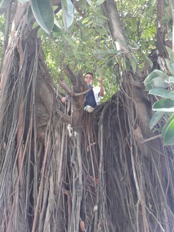 E voltamos a mim e meus amigos, passando pela praça, quando me vem a ideia: por que não tentar subir de novo, desta vez num galho mais alto? Disse isso em voz alta e muitos riram, dizendo: “Pra quê, cara?”. Mas alguns me incentivaram em nome da zueira e eu pedi que segurassem minha mochila enquanto eu escalava. Subi naquele primeiro galho e comecei a pensar em como proceder. Acabei me segurando nos cipós e me apoiando nos emaranhados destes para continuar a subida. E lá cheguei, no topo da árvore, a três metros e meio do chão. Poderia ter continuado a subir, escalando um dos galhos que surgem da bifurcação onde eu estava sentado, mas decidi ficar e apreciar a vista.