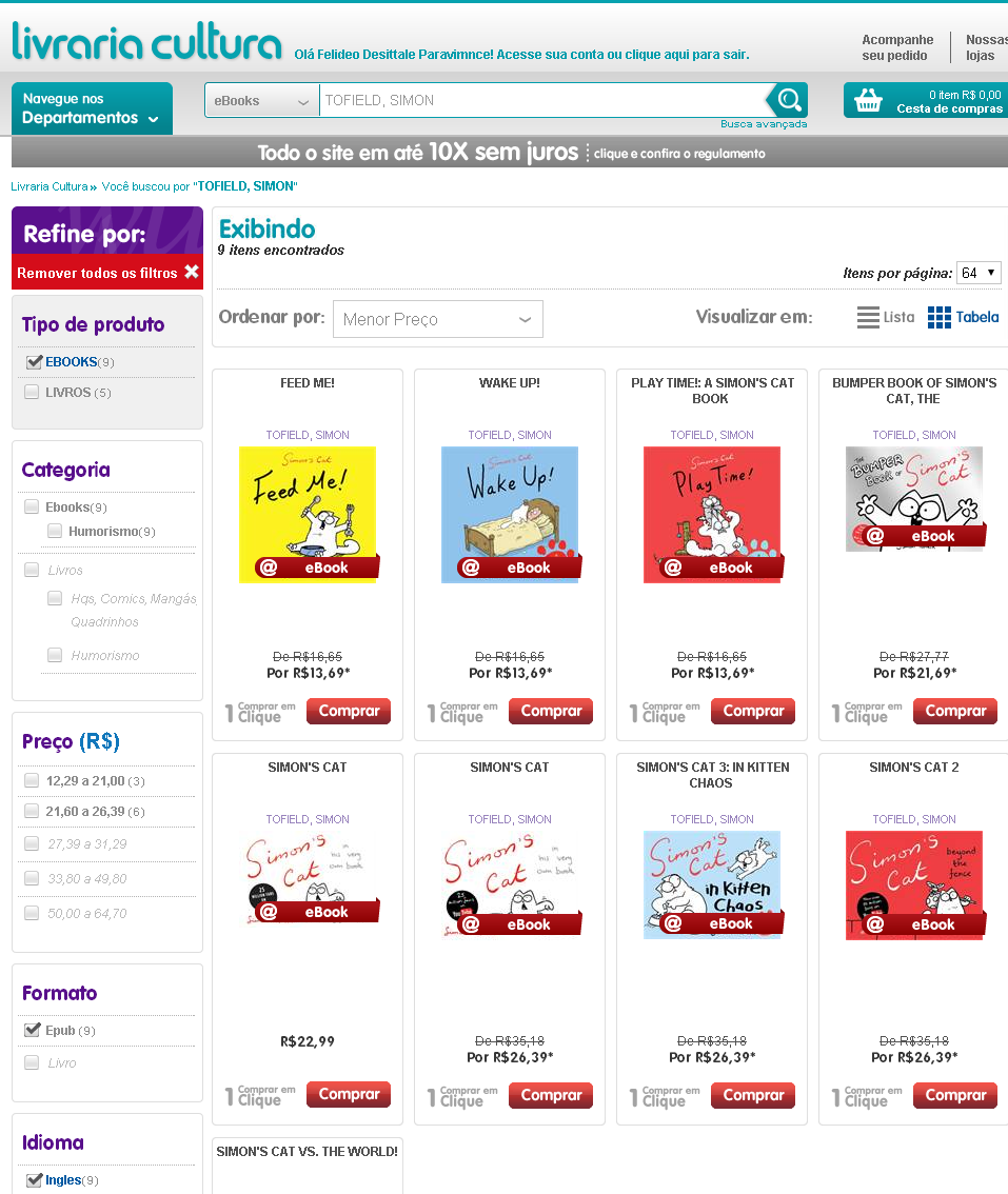 Sem falar que é sempre bom pesquisar o preço em diversas lojas para saber qual loja oferece o preço mais em conta (já peguei diferenças da mais de 15 reais em livrarias nacionais e portuguesas!) e por em quanto o preço do livro digital ainda é um absurdo (deveria ser um terço, se não menos, o preço do livro em papel)!
