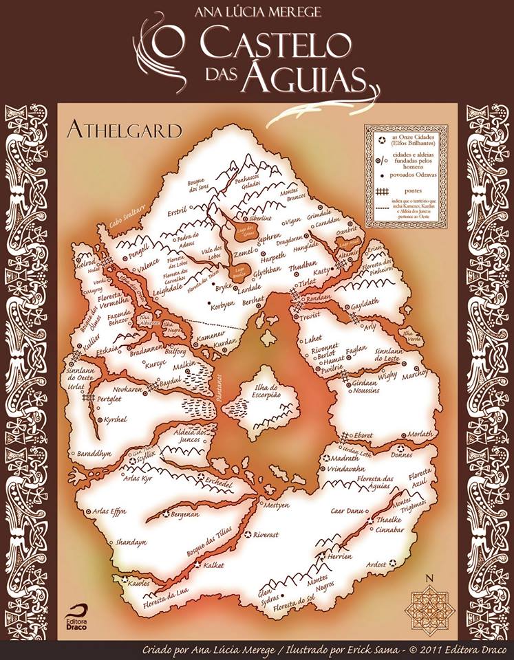 Quando escrevi as primeiras histórias em Athelgard, nada disso estava definido. Não havia um mapa, não havia coisa alguma. As histórias eram sobre uma tribo élfica, o Clã da Raposa Branca, que morava nos Penhascos Gelados, a região mais ao norte da ilha – para escrever sobre eles eu pesquisei muita coisa sobre Pré-História e sobre povos como os Inuit. Depois comecei a criar uma história também no norte, mas numa cidade de humanos chamada Siberlint. Foi aí que surgiu a primeira referência a Bryke, que em princípio seria uma colônia de elfos, vindos de cidades mais avançadas no sul. O primeiro desenho do mapa, que eu fiz em meados da década de 1990, não tinha nada no sul além dessas Onze Cidades. Depois apareceram a Floresta do Sol e Vrindavahn, onde se desenrola a trama de “O Castelo das Águias”. Tudo o mais foi sendo acrescentado à medida que eu precisava de localidades, rios, montanhas, florestas e tudo o mais. Ainda assim, dá para ver que o território nortenho é bem mais detalhado que o meridional.