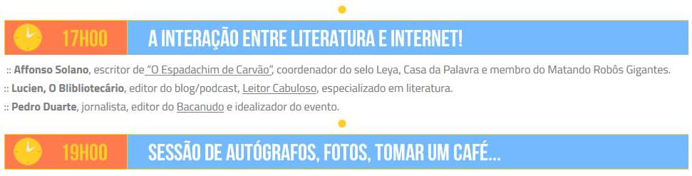 Sim, Cabulosos! No dia 20 de setembro, de 17h, na Livraria Cultura do Paço Alfândega de Recife-PE, eu participarei do Festival Bacanudo ao lado do meu amigo, Pedro Duarte (que é o organizador do evento) e do escritor Affonso Solano para falar sobre Internet e Literatura. Para os interessados é necessário se inscrever através do próprio site do evento (para se inscrever clique aqui).
