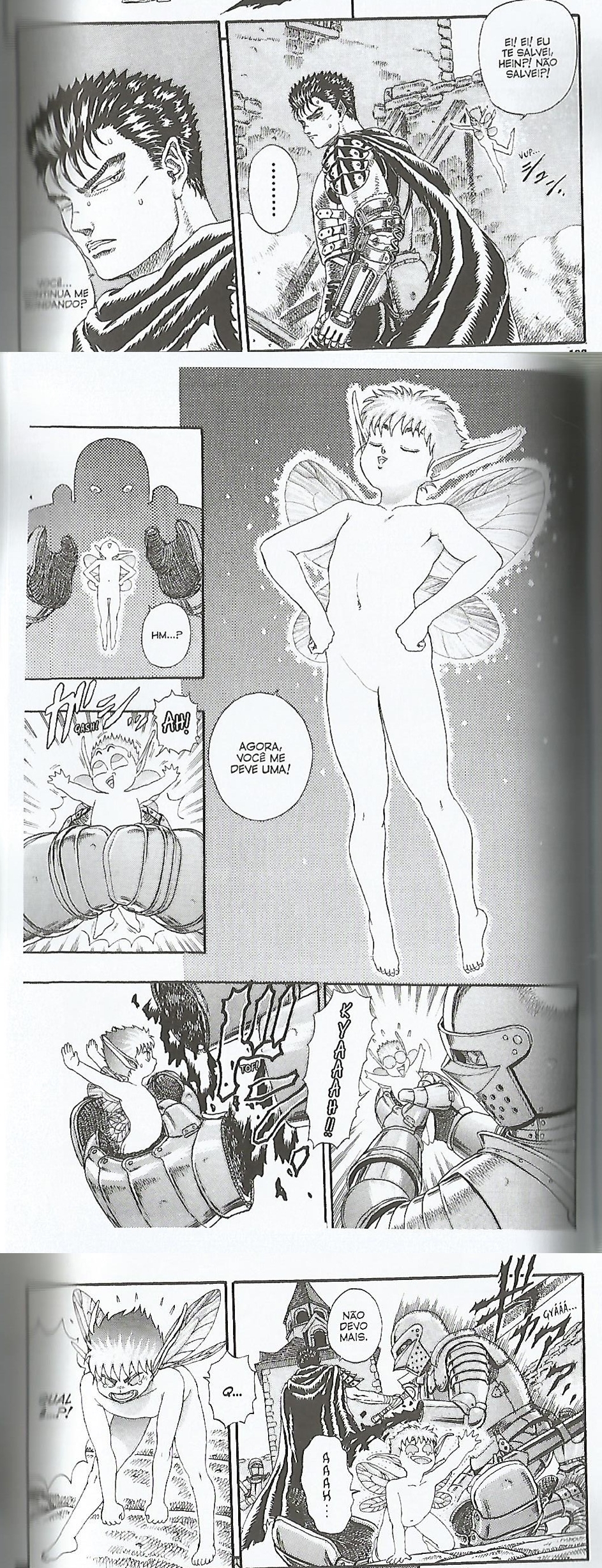 E Guts é realmente misterioso. Eu não conhecia Berserk, a não ser pela fama. Não tinha lido o mangá nem assisti nenhum episódio do anime e foi muito prazerosa a leitura desse primeiro volume. Não que quem já conhece o título não o acharia, mas é muito bom ler algo que você já sabe que vai melhorar, de ver que a fama não é a toa. Como eu não sei os pormenores da trama (só sei que a história foi inspirada em Macbeth de Shakespeare) o mangá é carregado de mistério.