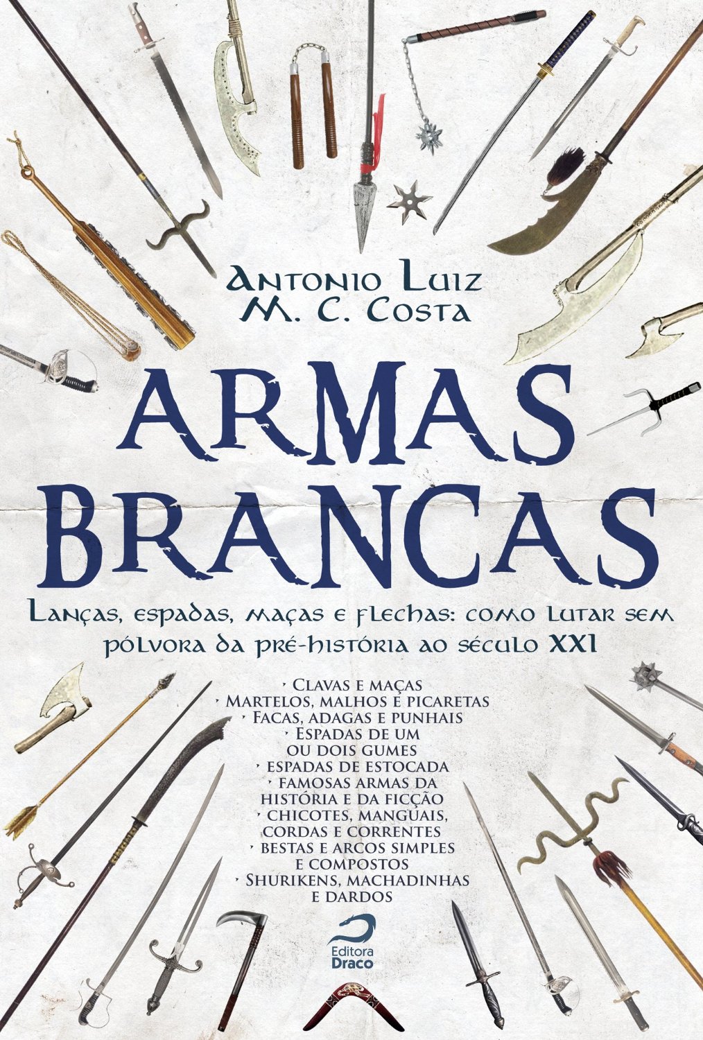 E foi pensando nisso que a editora Draco lança: Armas Brancas: Lanças, espadas, maças e flechas – como lutar sem pólvora da pré-história ao século XXI. Escrito por Antonio Luiz M. C. Costa que também é autor de Títulos de Nobreza e Hierarquias: um guia sobre as graduações sociais na história, além de ser autor de ficção especulativa e editor de política internacional da CartaCapital.