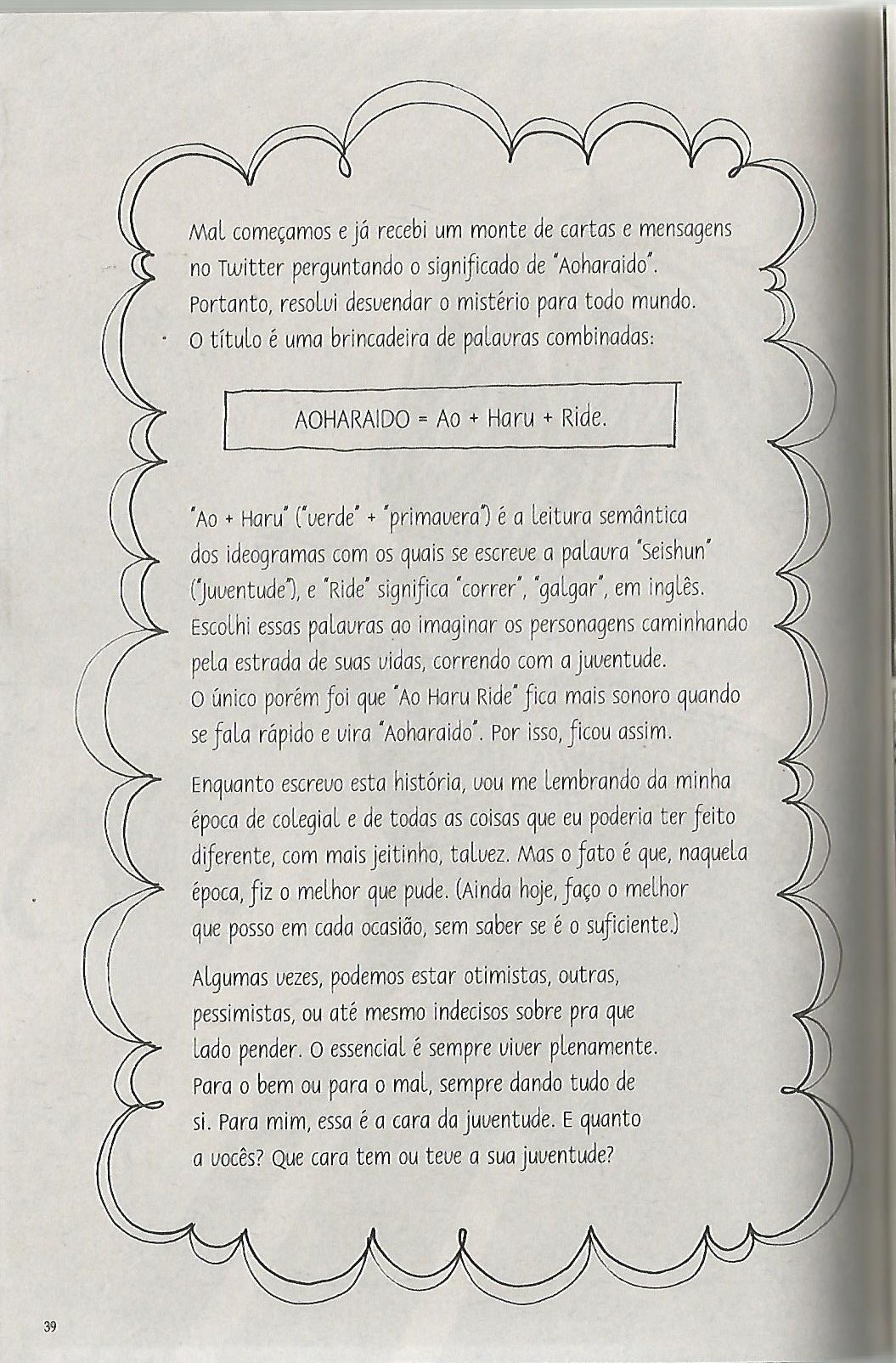 Aoharaido conta com capas internas coloridas e está com uma boa qualidade, sem páginas escuras ou borradas. O legal é que no final de cada capítulo temos uma palavrinha da autora. Gosto muito disso em mangás porque assim nos aproximamos do autor 🙂
