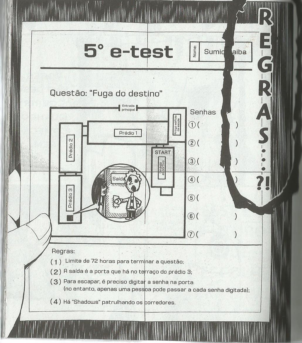 Além do mais Enigma diz que todos eles tem habilidades especiais, como a de Sumio. Cada um deles tem um desejo profundo e Enigma garante que podem consegui-lo se passarem no teste que é escapar da escola em até 72 horas. Para que todos os sete consigam escapar em segurança eles precisam encontrar sete senhas, uma para cada pessoa, que estão espalhadas pela escola, mas não é tão simples. Há Shadows patrulhando os corredores. O que isso significa vão descobrir da pior forma.