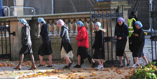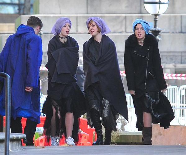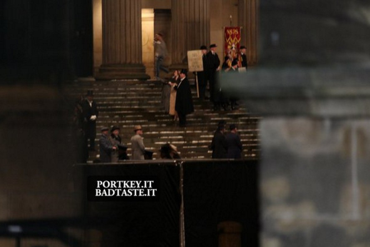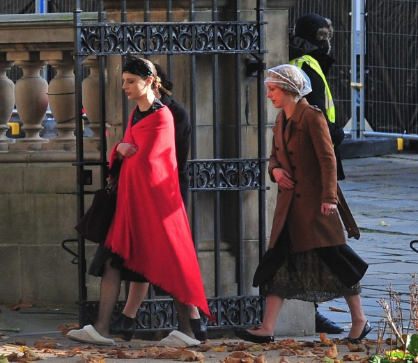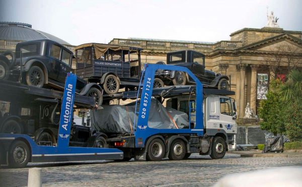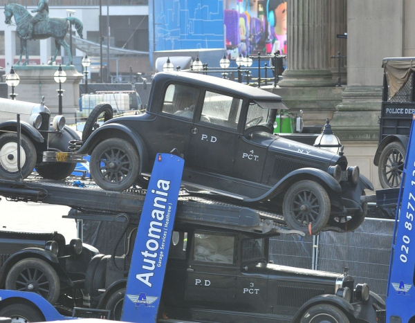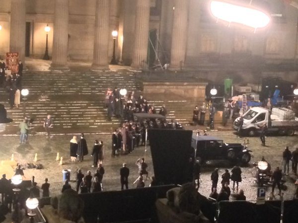 As filmagens estão acontecendo em Liverpool, e as fotos mostram alguns figurantes e carros antigos.
