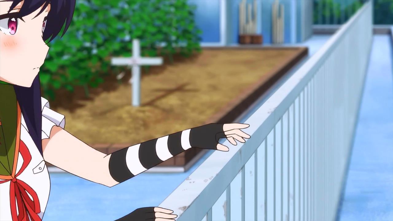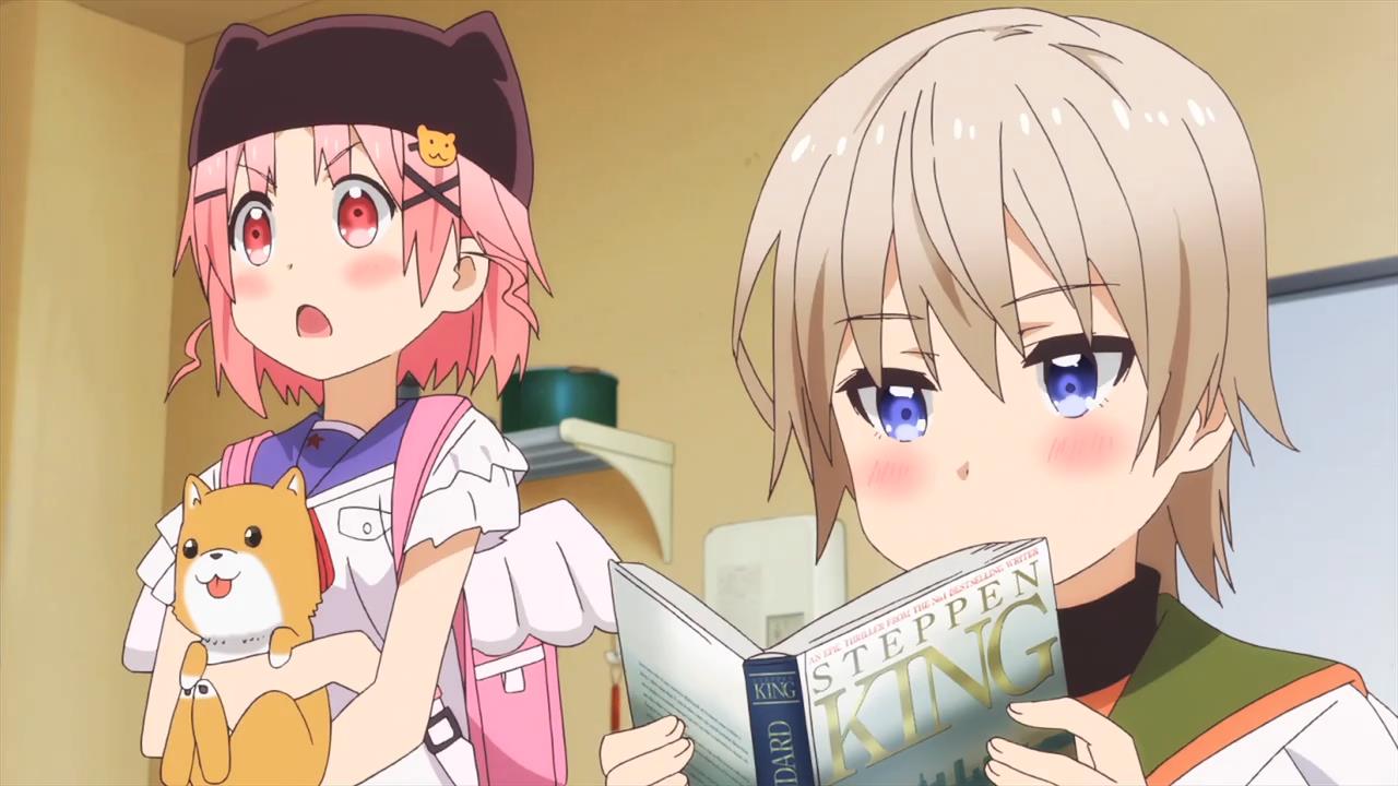Parece completamente um anime de vida escolar, recheado de meninas fofas que podem ser usadas como waifus. Particularmente estou cansada desse tipo de anime e vendo metade do primeiro episódio já larguei. Mas… lendo um texto sobre o primeiro episódio o autor definiu como sombrio e… oi? Como assim sombrio? Fui ver novamente o primeiro episódio com mais atenção e notei várias coisas que destoam de um anime comum de vida escolar: uma das garotas lê um livro de Stephen King (que está como Steppen King, mas a quem queremos enganar?), no terraço da escola há uma cruz, que sugere um túmulo e então chegamos ao final do episódio e sabemos a verdade.