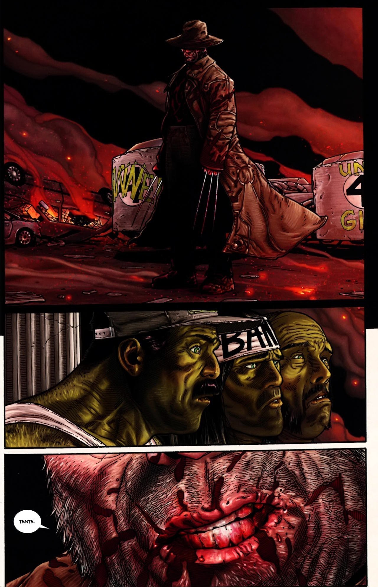 Devido ao fato de ter matado todos os X-Men, Logan jurou nunca mais usar suas garras, contudo após o assassinato de sua família pelos membros da gangue Hulk, motivam-no a ressucitar o Wolverine e promover uma chacina da própria gangue. Eis que somos levados até o matriarca da família, Bruce Banner, que revela seu plano de atiçar a ira de Logan, pois aquele estava entediado. O combate, sem muita emoção e com final bastante previsível, faz com que Wolverine mate Hulk e descida montar seu próprio grupo para por o mundo nos eixos.