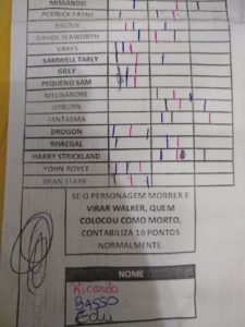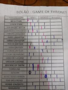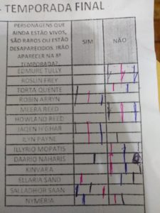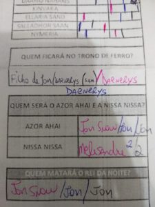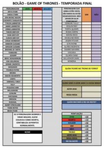 Um alto e sonoro “Parabéns! Continue com o ótimo trabalho!” de todos nós do Covil derrotados (ou não, caso a gente aqui do Covil vença, ai a gente ganha parabéns dos colegas de bancada) logo, já fica subentendido aqui, que retornaremos com esse podcast daqui alguns meses, no final da ultima temporada do seriado! Explicando melhor o bolão, ele basicamente é divido em algumas partes, a primeira é simples, dentre as personagens sugeridas, quem morre, quem vive e quem vira walker? simples e direto, depois seguido por personagens vivos mas que ninguém lembra, se eles reaparecem ou a serie esqueceu, depois a grande questão, quem senta no trono? Quem é o Azor Ahai e quem é a Nissa Nissa(eu juro que isso não é nome de waifu de anime) e por ultimo quem da a o kill no Rei da Noite! cada uma dessas perguntas tem uma pontuação descrita na imagem, que vocês devem baixar e preencher e colocar nos comentários dessa postagem pra participar da brincadeira com os meninos aqui do Covil! A IMAGEM: